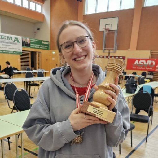 MU10: Ein hervorragendes Ergebnis erzielen die Mädchen in der U10-Kategorie. Leefke Giselbrecht vom Sk Bregenz holt sich die Silbermedaille und ihre Klubkollegin Turdiyeva Maryam landet direkt hinter ihr auf Rang 3. Leefke war bis zur letzten Runde souverän in Führung gelegen. Mit ihrer einzigen Niederlage in diesem Turnier, in der letzten Runde, konnte die Steirerin Röhrer Sonja aufgrund der besseren Feinwertung noch an ihr vorbeiziehen.