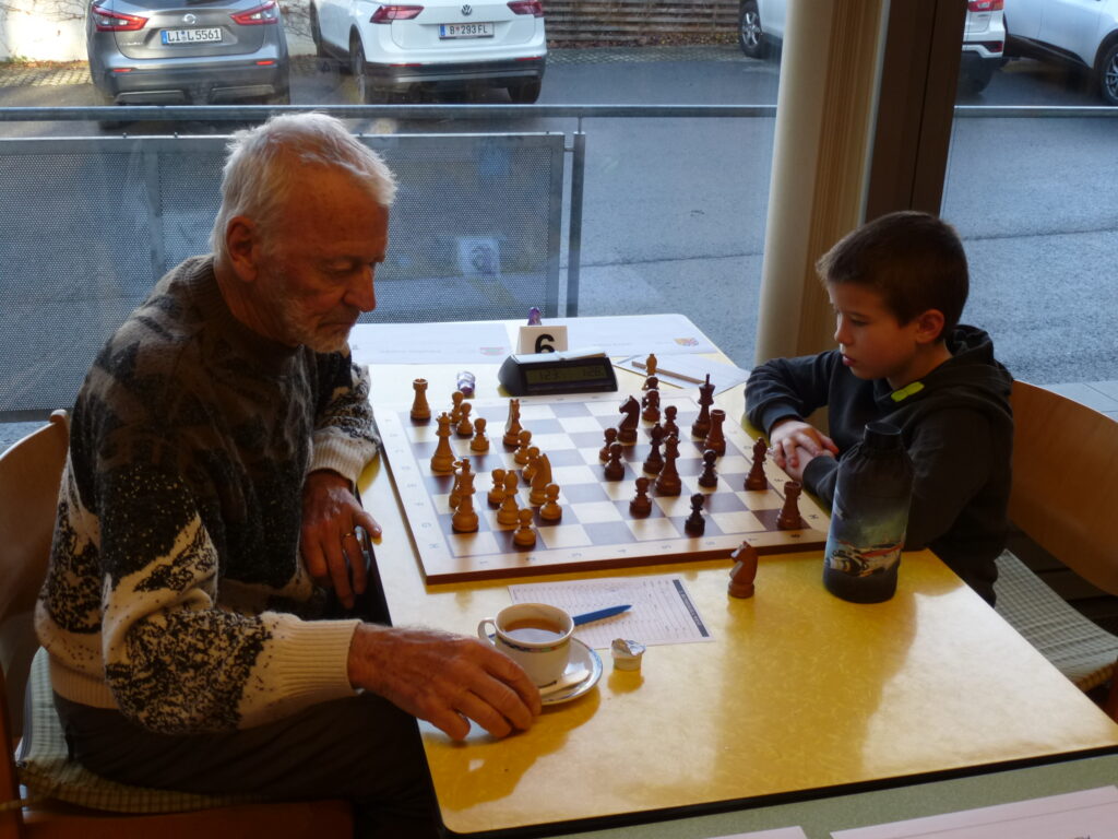 Im vergangenen Herbst wurde das originelle, von Julia Novkovic in’s Leben gerufene Generationenturnier zum vierten Mal ausgetragen und kurz vor Weihnachten beendet. Im schönen, von ihr wieder gemütlich eingerichteten Dornbirner Vereinslokal machte es Alt und Jung sichtlich Spaß, ihre geistigen Kräfte untereinander zu messen. Beide Mannschaften bestanden aus 9 Spielerinnen und Spielern und traten mit voller Bedenkzeit gegeneinander an. Auffallend war es dabei zu sehen, wie eine neue Gruppe starker Vorarlberger Jugendlicher heranreift. Gegen die erfahrenen Senioren gab es nach 6 Begegnungen zwar eine Niederlage, weil die Runden 1 und 2 unglücklich verliefen, doch dann erwiesen sich die Youngsters als gleichwertige Gegner. Besonders interessant sind immer Partien von Teilnehmern mit großem Altersunterschied, wie auf dem Foto sichtbar (Sigi Räuber gegen Julius Erath – 80 Jahre Altersunterschied).